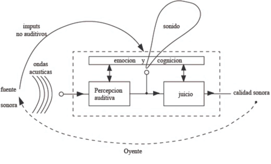 Figura 2. Esquema del proceso de la valoración de la calidad sonora (Barrio, 2001). Tomado de Blauert y Bodden, 1994, p.743