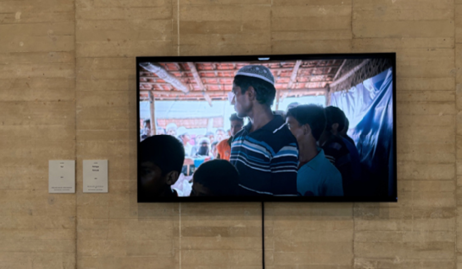 Figura 2. Una pantalla exhibe la obra de Ai Weiwei, Rohinyá (2021), un documental sobre el mayor campo de refugiados del mundo, ubicado en Cox’s Bazar, Bangladés. Fotografía de Mo Li (2024).