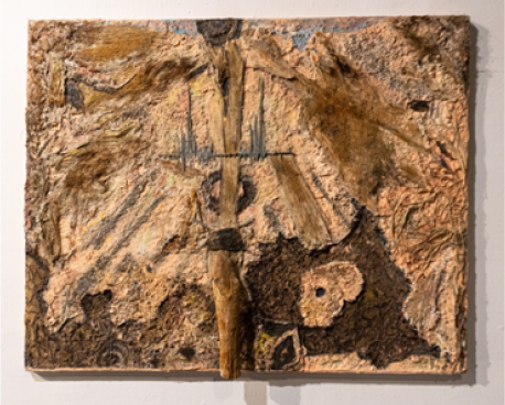 Nota. Verónica Ayala Abad, 2024, collage y técnica mixta con materiales de bioconstrucción y fibras de coco. fotografía realizada en la exposición Todos los caminos llevan aquí, Galería CIF Mnz14 en Guayaquil, Ecuador.