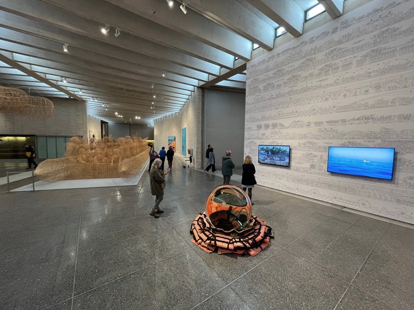 Figura 2. Una pantalla exhibe la obra de Ai Weiwei, Rohinyá (2021), un documental sobre el mayor campo de refugiados del mundo, ubicado en Cox’s Bazar, Bangladés. Fotografía de Mo Li (2024).