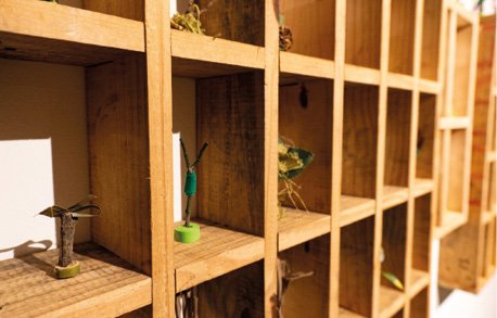 Nota. Naomi Moreira, 2024, gabinetes, madera, textil, plástico, fotografía realizada en la exposición Todos los caminos llevan aquí, Galería CIF Mnz14 en Guayaquil, Ecuador.