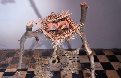 Nota. Adriana Karolina Narváez, 2024, Bioplástico, madera, ramas, arcilla, paja, metal. fotógrafia realizada en la exposición Todos los caminos llevan aquí, Galería CIF Mnz14 en Guayaquil, Ecuador.