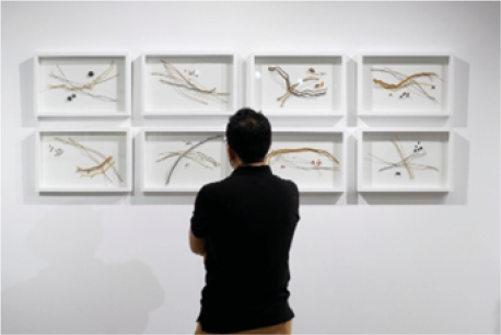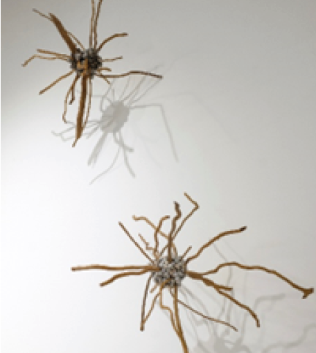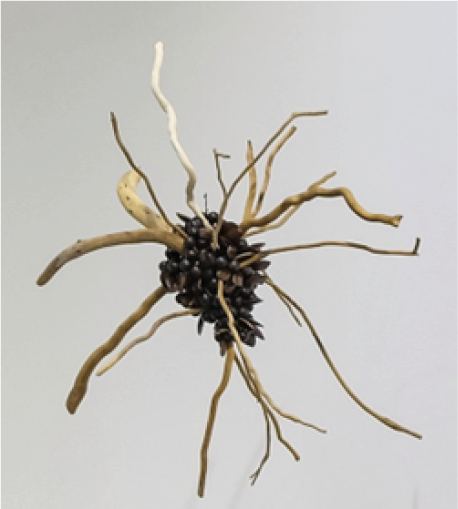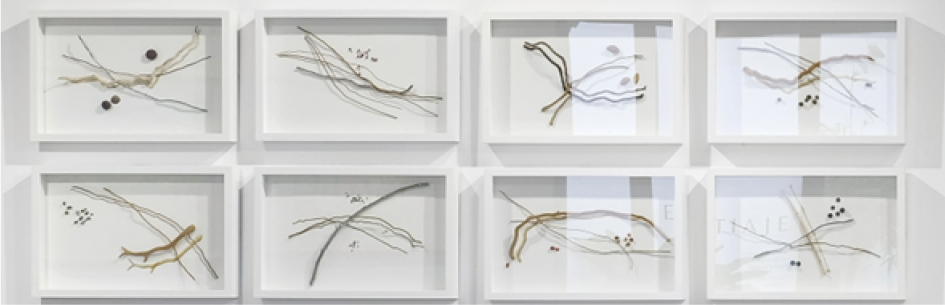 Córdova y Suasti comparten la práctica del tejido. La primera, a través de sus esculturas de neuronas y tejidos neuronales (figura 2, 3 y 4,), medita sobre el funcionamiento del cerebro y el cuerpo humano, explorando cómo los mecanismos de la vida contemporánea afectan fases vitales como el sueño. Lo efímero de sus obras sugiere la fragilidad de todo equilibrio. Sus dibujos y ensamblajes parecen ser partituras de una sinfonía natural, creando efectos ópticos que juegan con el misterio entre lo real y lo representado (figura 5 y 6). Córdova, en el pasado, ya había trabajado con materiales tales como semillas y palos en obras como Éxodo (2019), Pasamontañas (2020), Still Life (2018) y Creciente (2018).