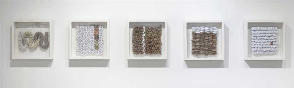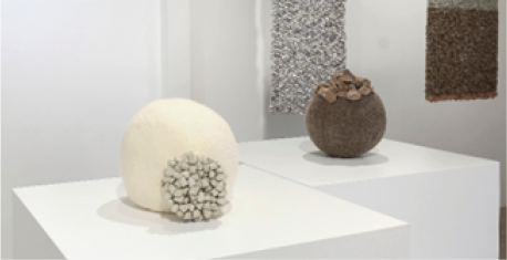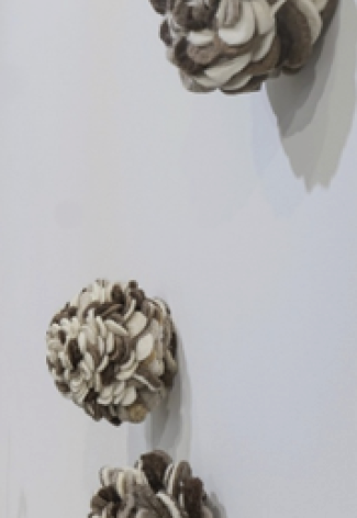 Por otro lado, Suasti ha explorado extensamente el uso del fieltro amasado a mano y el papel maché, creando formas orgánicas y texturadas (figura 7 y 8). Sus objetos oscilan entre lo abstracto y lo natural, evocando piedras pequeñas y crustáceos como los oniscídeos, caracterizados por su capacidad para enrollarse como mecanismo de defensa. Le interesa la ambigüedad entre la aparente suavidad del textil y la dureza de lo mineral y vegetal. La artista emplea el gesto primitivo y minimalista de aplastar la masa entre las manos, logrando una elocuente materialidad cercana a la de huesos o rocas (figura 9 y 10).