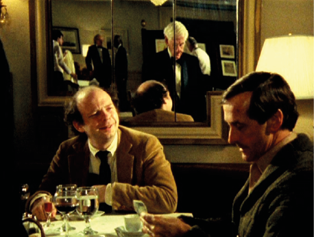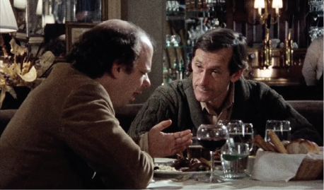 La escena sucede en el mismo interior del restaurante que atraviesa el filme; la cámara suele permanecer estática o con movimientos mínimos, privilegiando planos medios y primeros planos sostenidos que constriñen el espacio hacia la mesa. Esta economía de encuadre —dos personajes en una geometría cerrada, apenas desplazamientos de cámara— produce una sensación de “célula” social: el restaurante funciona como un microespacio disciplinario. La iluminación es generalmente cálida pero contenida, sin grandes contrastes, lo que reduce el horizonte visual y focaliza la atención en los rostros y los gestos, hablándonos también de la domesticación del espacio. La duración de las tomas y la predilección por los planos largos obligan al espectador a habitar el tiempo social de los personajes; no hay cortes que promuevan la sensación de escape, sino una inmersión lenta que refleja la repetición y la rutina. Respecto a estos planos, rozando los planos-secuencia en muchas ocasiones, Bazin (1958) sostiene que estos permiten al espectador percibir la duración del tiempo de manera más auténtica, otorgando una sensación de continuidad que refuerza la inmersión en la experiencia cinematográfica. Así, la puesta en escena no solo captura el espacio físico del restaurante, sino que también intensifica la percepción del tiempo social y existencial que atraviesa a los personajes (figura 2).