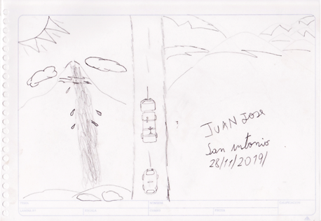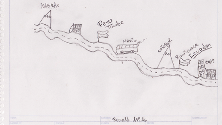 El dibujo+mapa 1 (figura 1) iniciado por Juan José y finalizado por Frangelys Domínguez (19 años), su compañera de vida, migración y retorno relata el viaje terrestre sobre una “mula” (tráiler) a la que subieron en la vía Panamericana en algún lugar de Arica, Perú, después de “hacer cola” (pedir aventón) para dirigirse a la frontera con Chile. Leída de frente, la composición horizontal está conformada por tres segmentos verticales. El primero contienen el sol, un nevado, dos nubes, agua, una cascada y dos piedras. El segundo, una rectangular carretera vertical por la que circula hacia arriba el tráiler transportando dos humanxs —la figura grande él y la pequeña ella— y un automóvil.