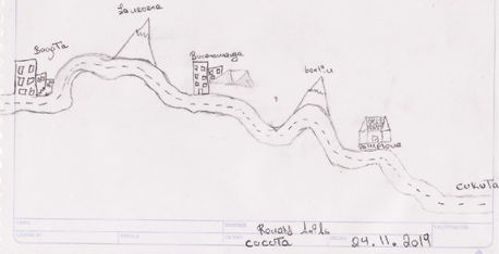 Figura 3. Dibujo+mapa 2: Díptico Subiendo de Venezuela. Archivo del proyecto de investigación+creación de arte andante (walking art) Paisajes Migrantes Andinos. 2019.